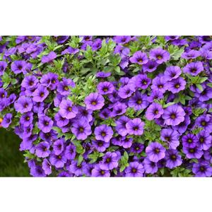 Deep purple blooms grace this Calibrachoa. Calibrachoa is a lovely addition to any bed, landscape or container. It has a mounding habit, with it reaching heights of 8” and spreading to 10”. It has green foliage and vibrant colored flowers that fall gracefully over container edges or baskets.