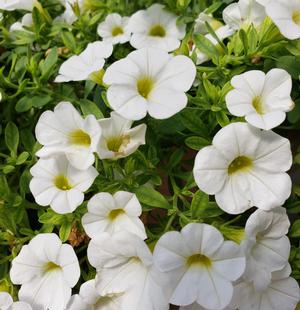 White calibrachoa add a fabulous touch of simplicity to your garden. Calibrachoa is a lovely addition to any bed, landscape or container. It has a trailing habit with it reaching heights of 8” and spreading to 16”. “Callie” blooms early and maintains blooms throughout the Summer and Fall. It has green trailing foliage and vibrant colored flowers that fall gracefully over container edges or baskets.