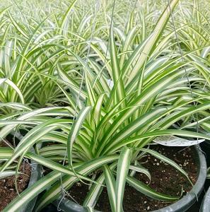 The Spider Plant has long green leaves with yellow centers. It does well in containers and hanging baskets and although it prefers an indoor environment, it can be kept outside as well. Removes any brown tips or yellow leaves to keep this plant thriving. Do not overwater, as the Spider Plant is susceptible to root rot if it gets waterlogged.
