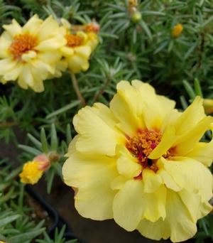 Portulaca Sundial Yellow's heat loving and drought resistant characteristics make it a superb plant for late Spring and Summer weather. Sundial Yellow grows spiky, trailing greenery with sunshine yellow flowers blooming amidst the foliage. Portulaca Sundial blooms repeatedly all summer long. It has average watering needs so simply water regularly. The Sundial series sets blooms 10-14 days earlier than most varieties. This annual is an excellent performer that requires very low maintenance.