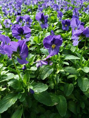 Penny Blue Violas appear to be miniature versions of the Delta True Blue Pansies. Mix these with Deep Blue Blotch and Light Blue Blotch pansies for waves of blue in your landscape. Violas have a distinct pattern in the way they bloom. They have a semi-trailing habit and are very versatile and adaptive, making them a great addition to a hanging basket or patio pot. They will continue to flower through the winter in mild climates and will pick up where they left off once the snow melts off the plants. They flower earlier and longer than other fall plants, even in low light.